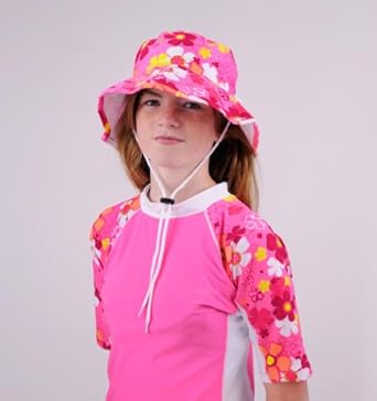 The TUGA reversible bucket hat for girls is designed to offer a great look and excellent sun protection from damaging UV rays. The hat is UV sun protective and possesses a wide brim to shade the neck, head and face. These hats look terrific paired with TUGA swimwear! A removable and adjustable chin strap helps to improve fit in windy conditions. The hat is reversible to provide great versatility. Tuga logo embroidered on solid side. Hats are made from chemical-free fabrics with UPF 50+ protection, which offers maximum sun protection! TUGA Sunwear prides itself in its UV (UVA and UVB) Protective swimwear with UPF 50+ rated fabrics. Comfortable. Lightweight. Dries fast. Great fabrics. PLEASE BE AWARE THAT DUE TO LIGHTING, THE COLOR OF SOME GARMENTS MAY APPEAR DARKER/LIGHTER IN REAL PERSON. Use age as a starting point for hats, but please measure the head circumference for best fit. SMALL: 18-19'' for head circumference. MEDIUM: 19-20.5". LARGE: 21-22". All Measurements in Inches.
